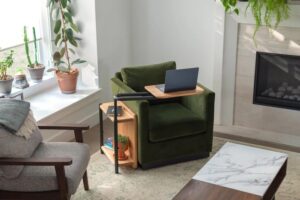 Homeowners have a handy spot to easily access coffee, work or play on a laptop and keep essentials within arm’s reach, all while lounging on a couch or bed. Discreet hardware allows the tray to be adjusted 25-30 inches from the floor. The arm and tray of the side table each swivel 360 degrees for perfect positioning. The arm extends for a reach of up to 18 inches from the edge of the couch or bed to the center of the tray.